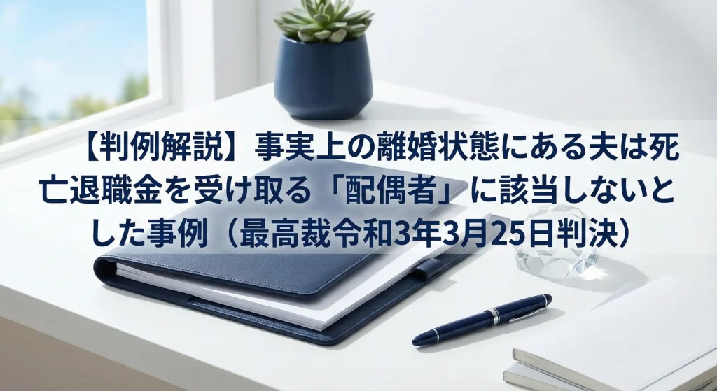 この記事のポイント 争点:戸籍上の夫婦であれば、長期間別居し「事実上の離婚状態」でも、死亡退職金の受け取り手(配偶者)として認められるか? 結論:裁判所は「認められない」と判断した。 形式的な戸籍よりも実態を重視し、次順位である「子」への支...