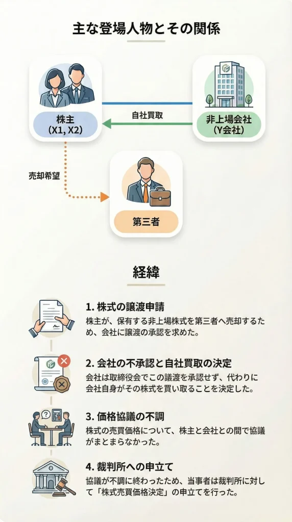 ある非上場会社(株式の譲渡につき取締役会の承認が必要な会社)の株主らが、自分たちの持っている株式を第三者に売却しようとしました。しかし、会社側はこれを承認せず、代わりに自社でその株式を買い取ることを決定しました。