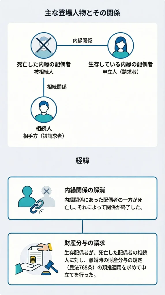 • 争点:内縁関係(事実婚)が一方の「死亡」で終了した場合、離婚時と同じように財産分与を請求できるか?