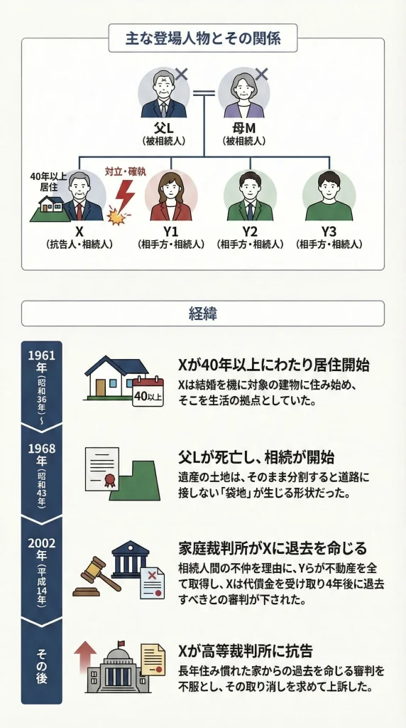 • 抗告人(Xさん):72歳の高齢者。対象となる土地上の建物に40年以上居住しており、そこを生活の拠点としていました。