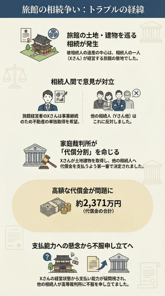 家庭裁判所の審判(第一審)では、「旅館営業を守るため、土地はXさんが取得する。その代わり、Xさんは他の相続人に相応のお金(代償金)を分割払いで支払いなさい」という決定が出されました。