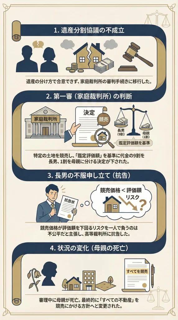 これに対し、長男Xは納得しませんでした。「競売になれば、評価額よりも安く買い叩かれる可能性が高い。母親は価値の確定した不動産をもらうのに、自分だけが『安くなるかもしれない競売代金』を計算上の金額で押し付けられるのは不公平だ」と主張し、高等裁判所に不服を申し立てました。