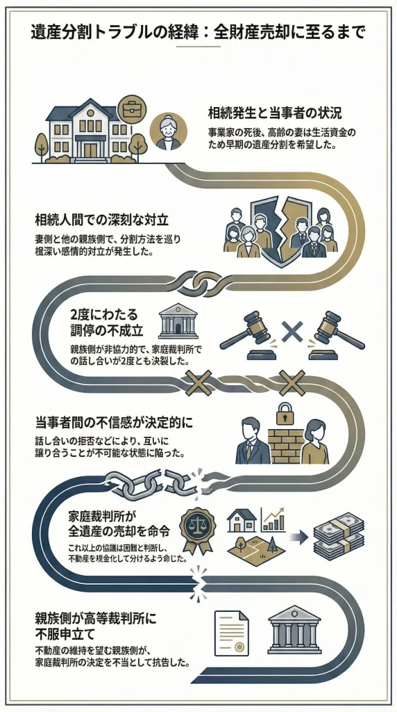 本件は、ある資産家の遺産分割協議がこじれにこじれ、最終的に裁判所が「不動産をすべて売却してお金で分ける」という解決策(換価分割)を選択した事例です。