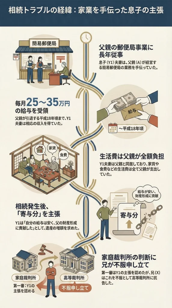 本件は、簡易郵便局を経営していた被相続人が亡くなり、その事業に従事していた子供(相続人)が「家業に貢献した分、遺産を多くもらう権利(寄与分)がある」と主張し、それを認めなかった他の兄弟と争いになった事例です。