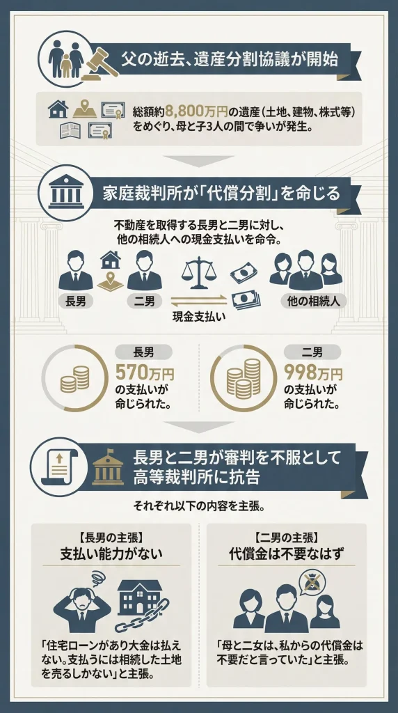 - 結論:高等裁判所は、支払能力や当事者の意向を調査せずに代償金の支払いを命じた家庭裁判所の審判を取り消した。