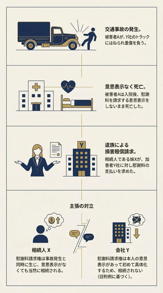 この裁判は、交通事故で亡くなった被害者の遺族が、加害者の会社に対して損害賠償(慰謝料)を求めた際に、「亡くなった本人の無念(慰謝料請求権)」を相続できるかどうかが争われた事例です。