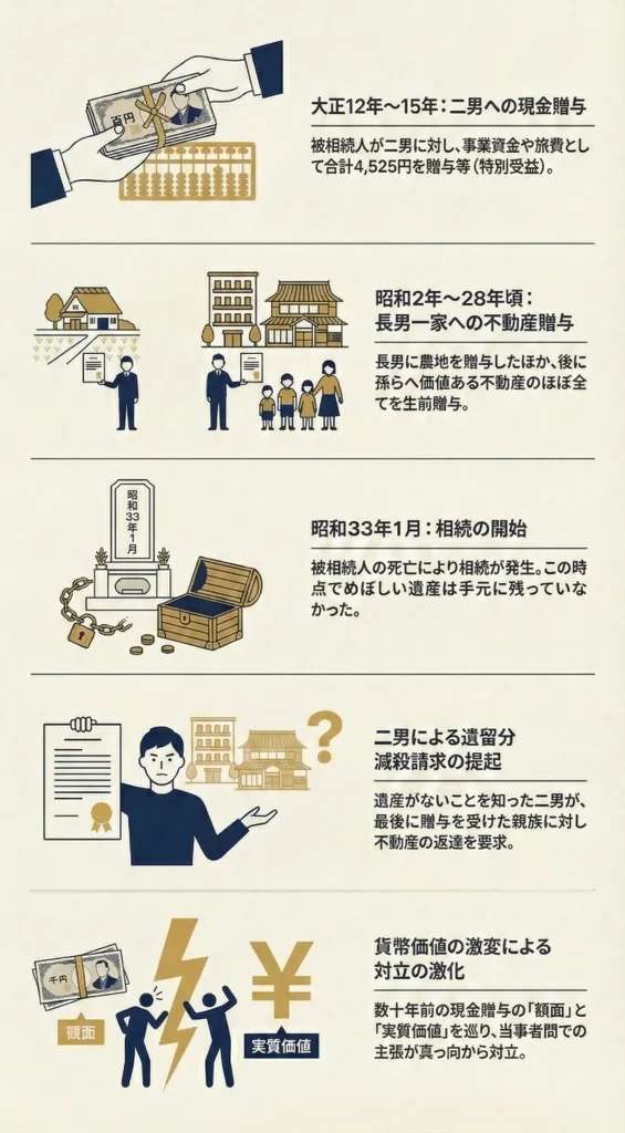 • 争点:数十年前に贈与された金銭を遺留分算定に組み入れる際、贈与時の金額のままでよいのか、それとも相続開始時の貨幣価値に換算すべきか?