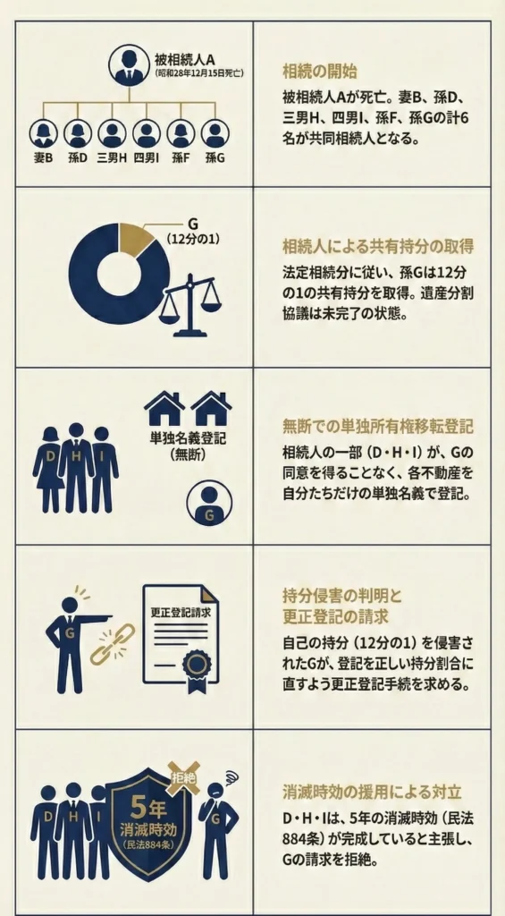 D・H・Iは「Gの請求は相続回復請求権(民法884条)に基づくものであり、5年の消滅時効が完成しているから応じる義務はない」と反論しました。